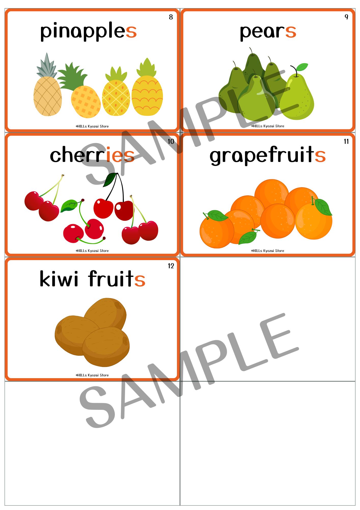 〇内容:表紙、果物(複数形)12種類、一覧表の全13ページ。