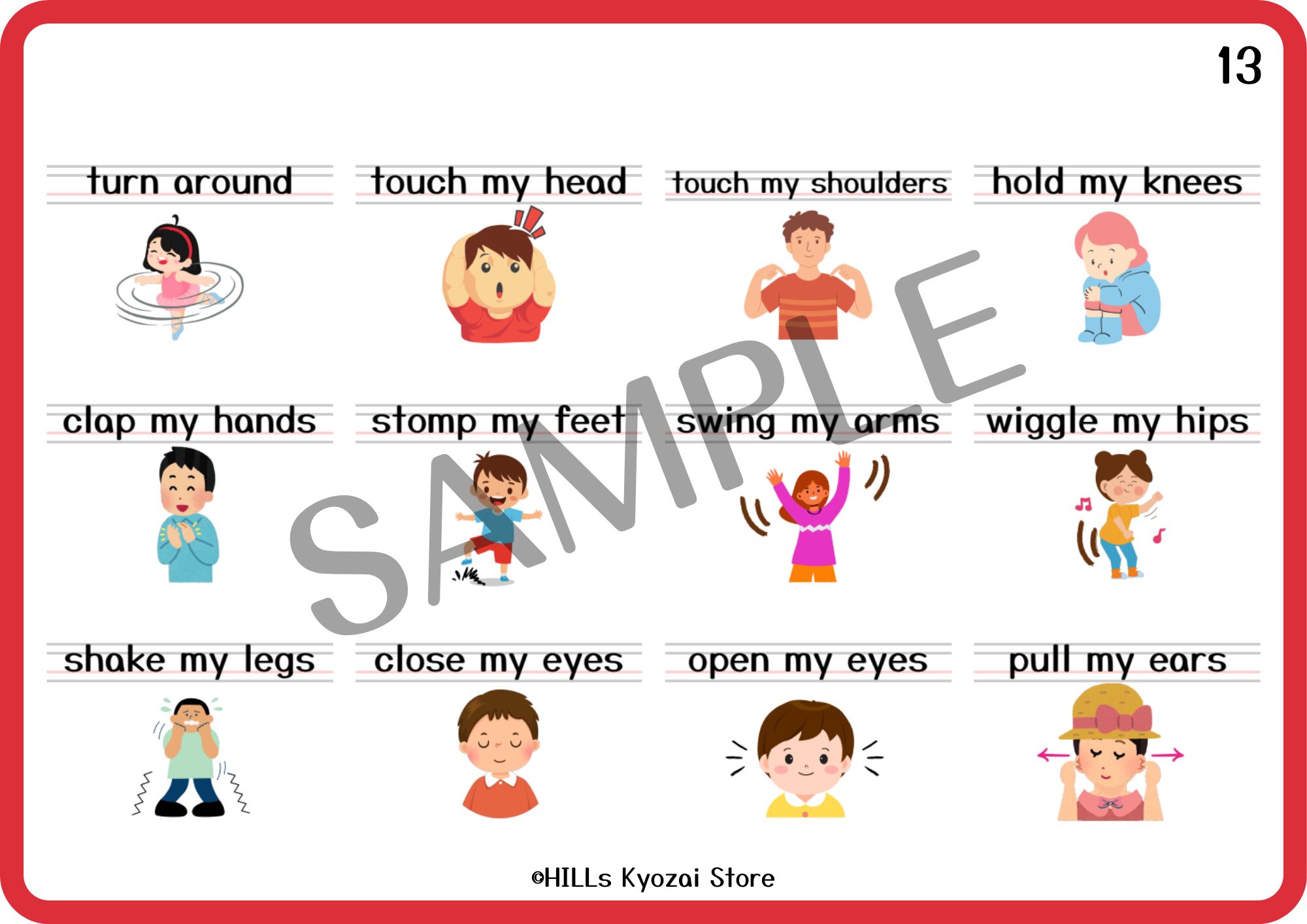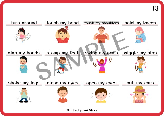 〇内容:表紙、身体の部分を使った動詞12種類、一覧表の全14ページ。