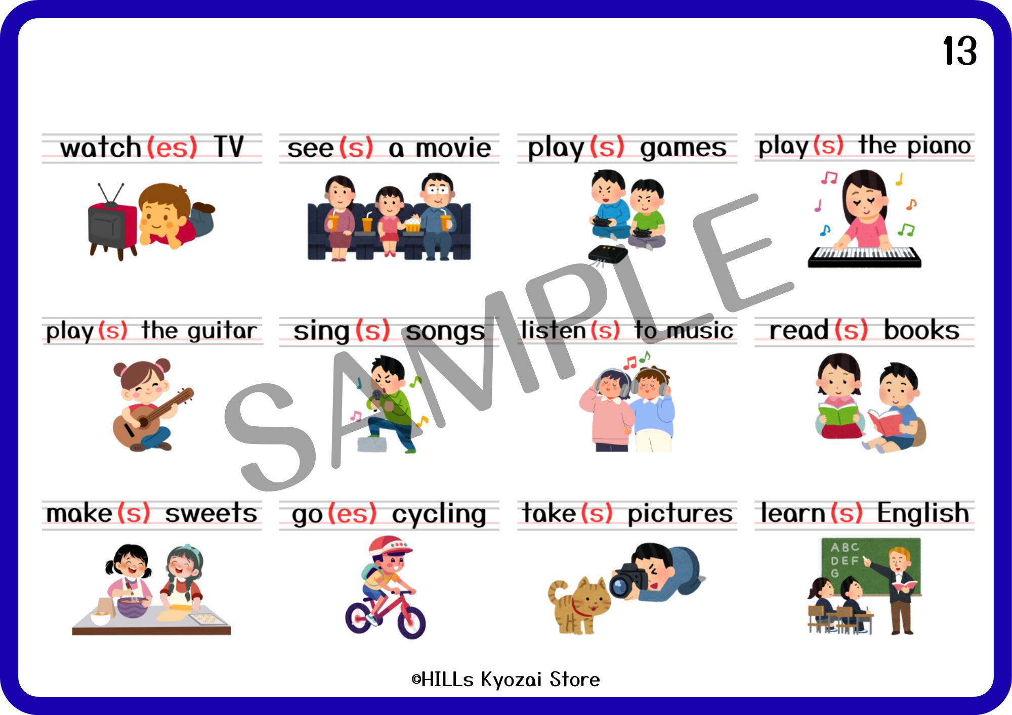 〇内容:表紙、趣味の動詞12種類、一覧表の全14ページ。