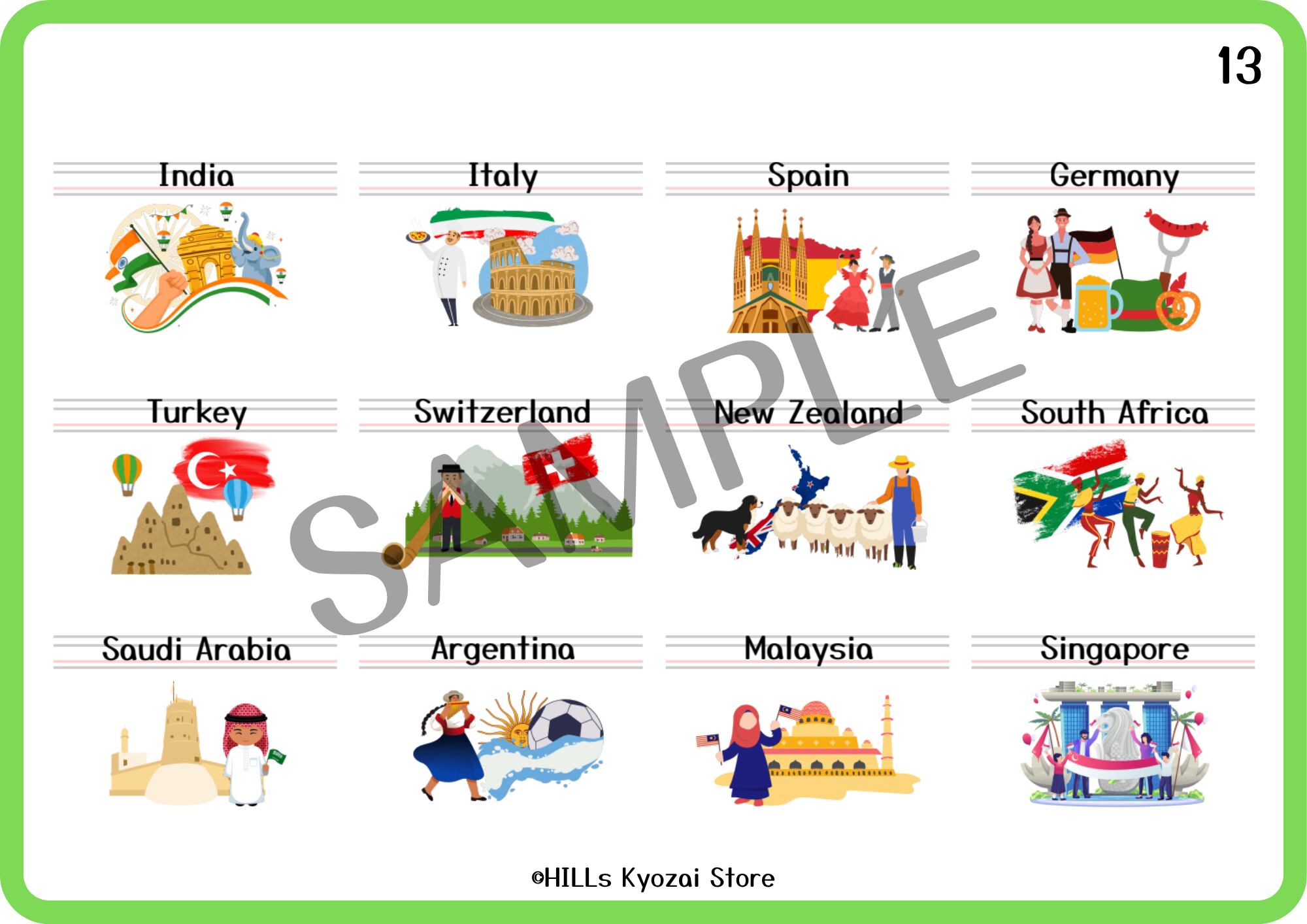 〇内容:表紙、国12種類、一覧表の全14ページ。