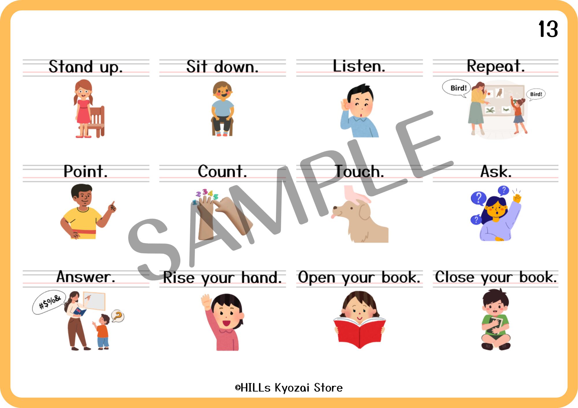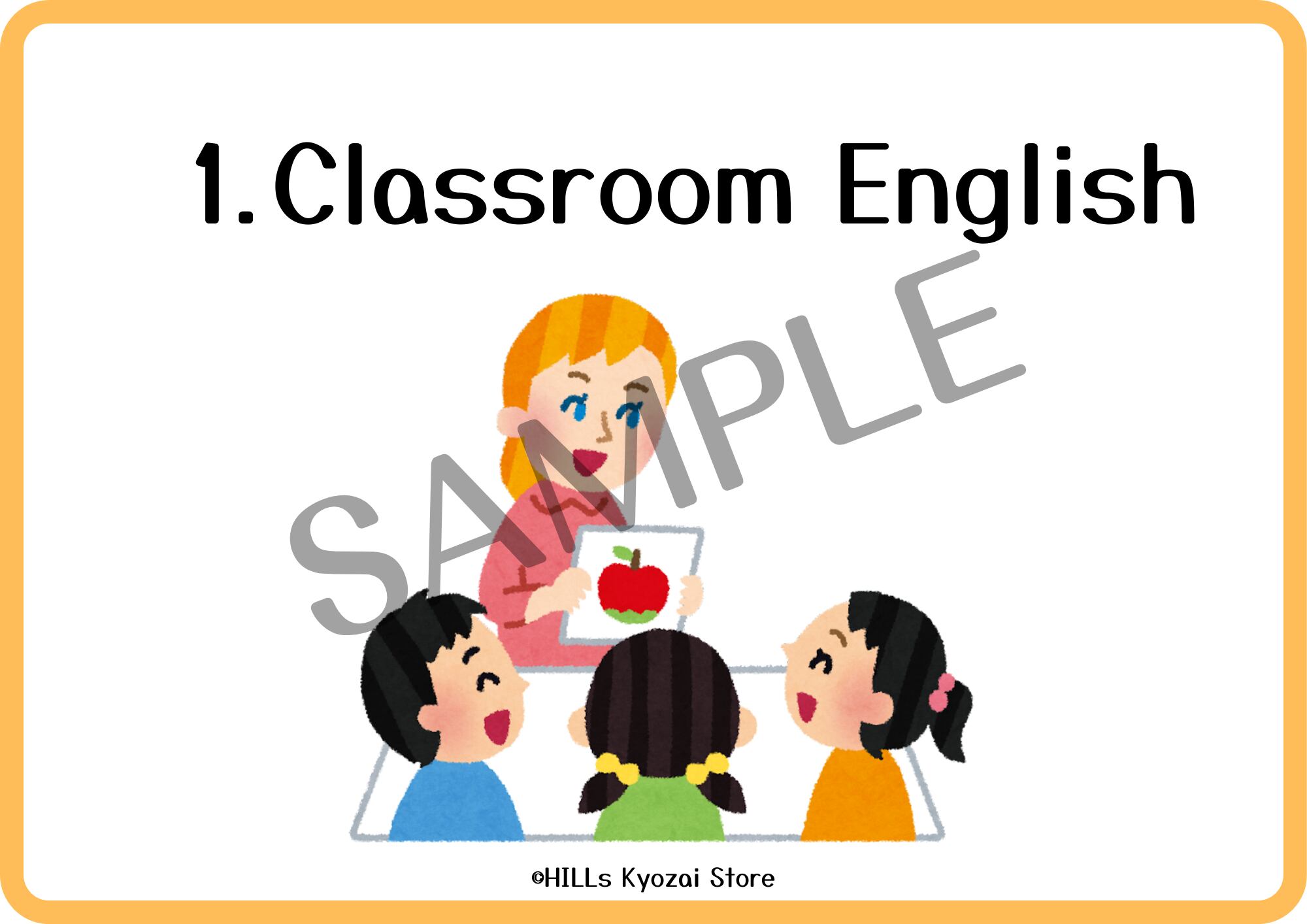 〇内容:表紙、クラスルームイングリッシュ12種類、一覧表の全14ページ。