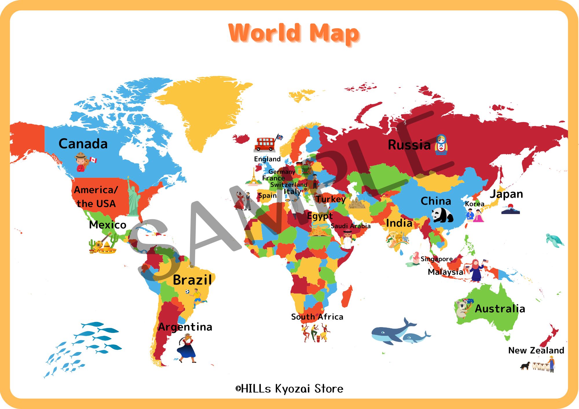 〇内容:Countriesのフラッシュカード①②の計24の国を載せた世界地図ポスターです。